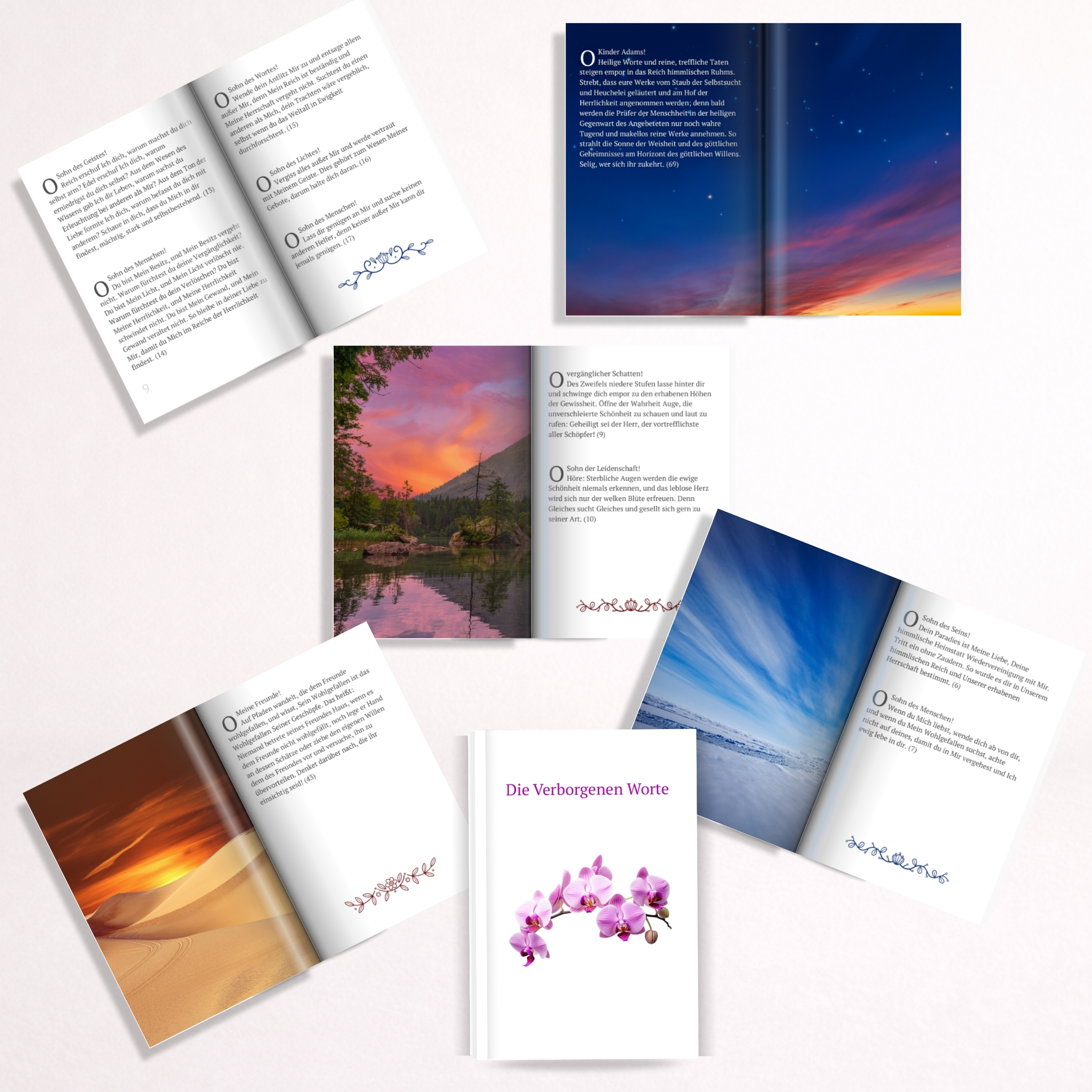 Bahá'u'lláh gibt auf diese uralten Fragen keine philosophischen Abhandlungen. Er antwortet mit etwas viel Unmittelbarerem: mit dem direkten Anruf an die Seele. Jeder Aphorismus ist wie ein Spiegel, der dem Leser vorhält, was in ihm bereits angelegt ist – ein verborgenes Gut, eine Würde, die nicht erworben werden muss, sondern die darauf wartet, entdeckt zu werden.
